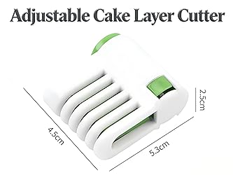 This 2-piece Cake Leveler set helps create perfectly even layers for professional-looking cakes. The adjustable design accommodates up to 5 uniform tiers with precise thickness control. Simply press the buttons to secure your knife blade at the desired height, then glide horizontally to achieve consistently level cake and bread slices every time. The innovative spring mechanism securely holds most standard knives without slipping, making this Layer Cake Slicer both reliable and easy to operate for bakers of all levels. Compact and space-saving, this Cake Dividing Tool is ideal for home bakers working with cakes up to 10 inches in diameter, depending on your knife blade length. An essential Baking Tool for creating layered desserts, this DIY Cake Tool ensures uniform results for cakes, toast, and other baked goods with minimal effort.