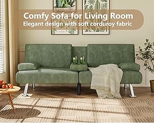 Selective Material: The futon is made of corduroy fabric that is skin friendly and durable for lifespan, filled with high-resiliant sponges, providing firm support and comfy sitting to your family. There are 6 legs, and 4 of them are metal material, which could bear 550lbs with much stableness. 3 Adjustable Positions: The convertible sofa bed has 3 levels of back adjustment, and the back is split design which supports separately adjusting, ranging from 120, 160 to 180 degrees, providing you versertile patterns as a standard couch, a reclining lounge, or a sleeper bed. Cupholders & Armrests: The central setting 2 cup holders are removable, you can get yourself a cup of tea at leisure time, and pull it up on back when on need. The 2 movable arm rests can also use as pillows or lumbar pads, that providing comfortable support. Suits Small Space: This modern futon couch can be easily and quickly switched, between a comfy living room furniture sofa and a practical futon bed. Once you have stay over guests, just unfold the sofa and get a quick sleeper bed. The space saving design is friendly for compact living rooms, dorm, apartment. Quick Assembly: Crafted for convenient shipment and easy assembling, an adult can finish the installation work within 20 minutes. Kindly please note all the sofa accessories as legs, cupholders, armrests and hardware are placed in the futon main part with a zipper.