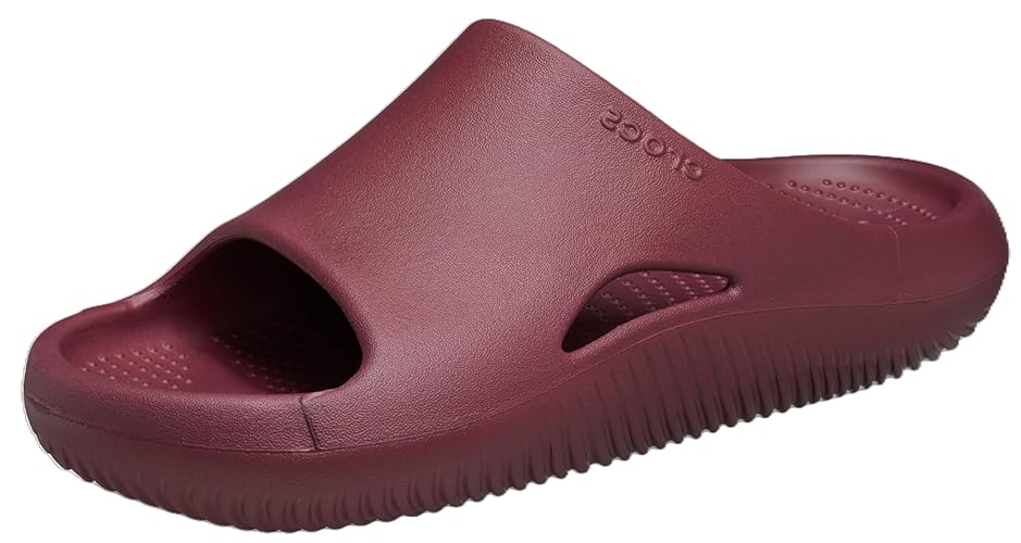- The leather MAYVEN slides feature comfy construction details like a molded footbed, a treaded flatform sole, and an adjustable top strap, plus a front strap with a geometric cutout design.