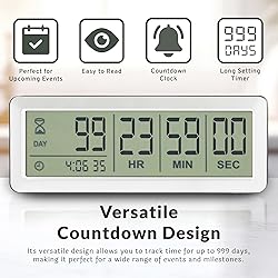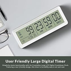 VERSATILE COUNTDOWN DESIGN: Perfect for any event or milestone, the Countables Large LCD Digital Countdown Clock functions as a versatile countdown clock. Track time up to 999 days, making it ideal for vacations, birthdays, and more. IDEAL COUNTDOWN CLOCK: Celebrate every moment with this versatile countdown timer. Perfect for tracking the days until retirement, vacations, birthdays, and other important events, the Countables clock adds excitement and anticipation to any countdown. USER-FRIENDLY LARGE DIGITAL TIMER: Featuring an easy-to-read large digital display, this countdown timer ensures clear visibility from across the room. Its user-friendly design makes setting and reading the time straightforward for everyone. DURABLE AND STYLISH CONSTRUCTION: Constructed with premium materials, the Countables timer is built to last. The sleek black finish complements any decor, while the robust design ensures it stands up to daily use without compromising on style. PERFECT FOR EVENTS AND LONG TERM PLANNING: Whether you're planning a big event or tracking long-term goals, this large digital timer is your go-to device. Its extended range of up to 999 days is perfect for countdowns to weddings, retirements, or major projects.