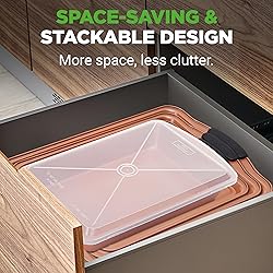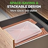 COMPLETE 5-PIECE SET - This 5-piece baking pan set is essential for everything from baking cakes and cookies to roasting vegetables. Includes a small, medium, and large cookie sheet, one rectangular pan, and a plastic lid, ideal for all your baking needs. EASY CLEAN NON-STICK COATING - Crafted with durable carbon steel and coated with a high-quality non-stick surface, these pans require no butter, oil, or cooking spray. Enjoy quick food release and a clean, odor-free cooking experience every time. HIGH HEAT COMPATIBILITY - Safe for use at temperatures up to 450°F, these pans are ideal for baking a wide range of treats from fudgy chocolate brownies to savory lasagna. They double as excellent serving trays for your finished dishes. SAFE SILICONE HANDLES - Equipped with red silicone handles, our professional-grade bakeware prevents accidental burns and ensures safe handling. These stain-resistant pans are easy to clean and dishwasher safe, though hand washing is advisable. SPACE-SAVING STACKABLE DESIGN - Made to conserve kitchen space, this non-stick baking set features a stackable tray design. Fully compatible with both standard and convection ovens, these pans are also suitable for use in refrigerators and freezers.