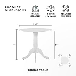 [Contemporary Dining Table] The structure of this white round dining table elevates the elegance of your dining space, transforming it into a standout furniture piece. Its stylish design effortlessly complements a range of decor aesthetics, rendering it a flexible enhancement to your household [Well Crafted] The round dining table is constructed with solid wood, sturdy and durable. With its white table top and finished hardwood pedestal legs, this dining room table emanates a contemporary aesthetic. Its striking round wooden design adds a touch of sophistication to any kitchen space, effortlessly complementing a variety of dining room styles [Perfect Size] Round table measures: 31.5"Dia x 30"H. The proportions are meticulously designed to fit seamlessly into your kitchen and dining area, ensuring it complements the space without dominating it [Easy Assembly] The package contains step-by-step illustrated instruction and hardware. Screwdriver (not included) is required for assembly [Peace of Mind Warranty] We offer a 1-year limited warranty, and if you have any issues with the product you purchased, please feel free to contact us / manufacturer