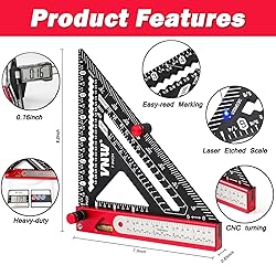 Multifunction Rafte Square - Square Rule,Protractor,1/16" Precision Steel Ruler,Marking Gauge,T-Bevel Gauge,Bubble Level Accurate Clear Scale - Checking the angle of the triangle ruler is quick and easy. The use of laser graduations makes the ruler clear,accurate and easy to read Durable Construction - Our rafter square made of precise and durable CNC-machined aluminum alloy,which is light and convenient Bubble Level -A sensitive 2-inch bubble level is integrated into the body to allow for quick checking of level surfaces.And You can also use the base alone as a level Premium Quality - Good oxidation resistance,not easy to break,each triangle ruler is thickened,corrosion-resistant and high hardness