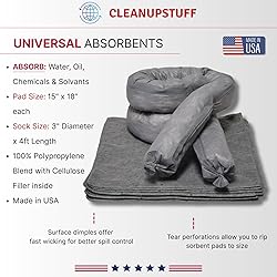 ABSORB 5 GALLONS - Universal 5 Gallon Spill Kit Bucket can handle water, oil or chemical liquids to assure a QUICK & EASY clean up that you can take anywhere with its compact size. SPILL CLEAN UP KIT CONTAINS: 10 - Absorbent Spill Pads 2 - Absorbent Socks - goggles - eye protection, gloves - hand protection and caution yellow disposal bags with ties to neatly clean up any spill. ALL IN ONE SPILL KITS - Whether you need a pair of water absorbent sock or oil spill absorbent pads - The 5-Gallon bucket kit with Universal Absorbents can do it all. HIGHLY VISIBLE, re-sealable 5 gallon weatherproof yellow bucket and EASY OPEN LID for quick access to spill absorbents make our kit the #1 choice for an easy to use and sight spill cleanup kit. UNIVERSAL FUNCTION - if you're unsure what oil spill kit you may need or any other chemical spill kit, you cannot go wrong with our UNIVERSAL Absorbents Kit to tackle any spill!