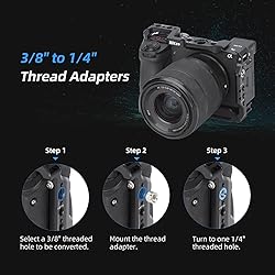 【For Sony A6700 Camera】Nitze T-S12A one-piece aluminum cage is compatible with Sony Alpha 6700 camera. You can firmly lock the A6700 camera by a 1/4" screw on the bottom and a M2 screw on the right side. It includes a magnetic flat-head screwdriver and a hex spanner for easy installation. 【Built-in Arca Swiss QR Plate】The bottom of the A6700 camera cage features a built-in standard Arca Swiss quick release plate. It is widely compatible with tripods or DJI RS2 / DJI RS3 / DJI RS3 PRO stabilizers. You can easily switch from handheld shooting to stabilizer or tripod shooting according to different needs. 【Integrated NATO Rail & Cold Shoe】Built-in cold shoe on the top of the A6700 cage allows you to mount your microphone, LED light, wireless transmission, etc. Built-in NATO rail on the left side supports the installation of accessories with NATO clamp such as Nitze PA29C ergonomic side handle. 【Multiple Mounting Holes】Several 1/4", 3/8” threaded holes, 1/4" locating holes, 3/8" ARRI locating holes on the Alpha 6700 cage are provided for accessories extension. The strap slots allow you to attach a camera wrist strap or shoulder strap. 【3/8" to 1/4" Thread Adapters】The Alpha 6700 camera cage is equipped with two 3/8” to 1/4” thread adapters which provide flexibility to turn a 3/8" threaded hole into a 1/4" threaded hole.