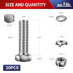 3/8-16 x 1-1/2" Hex Head Screw Bolt, Nuts, Flat & Lock Washers, 20Pcs 18-8 (304) Stainless Steel, Fully Threaded, by SG TZH
