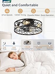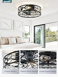 Caged Design: The low profile ceiling fan has excellent coloring process and quality control, which combines practicality and aesthetics. It's designed with the farmhouse and modern style——cage shaped frame, black painted finish and lacelike pattern, perfectly matching and decorating your home. Powerful&Quiet Motor: The pure copper DC motor provides strong and steady wind power; the 35dB low noise operation provides ideal quiet enviroment. And also our high-quality and long-lasting motor can save energy, 20-30% electricity less consumed Various Functions: The ceiling fan light fixture is featured with 6 wind speed levels, 1/2/4H time settings, reversible motor capable of forward and reverse rotation. Fan or lighting can be turned on separately Dual Convenience Control: You can operate all the functions via the free app or the included remote. Fix the remote to the wall as a permanent switch (wall plate and battery included).The app offers next-level ease: control your light and fan for any activity with a simple tap Bulbs Not Included: 4*E26 bulbs needed. You can select the bulbs as your like and habit. Recommeded bulbs:A19 ST19 T45, Incandscent light bulb-Max 60W, LED light bulb-Max 10W Quatily Assurance: LEDIARY flush mount ceiling fan with lights have 5-year motor support and 2-year support on other parts. We uphold the highest standards for all our products by testing each product for optimal performance, just buy with confidence