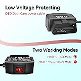 • GELRHONR OBD2 OBD Power Cable for Dash Camera ,OBD2 Diagnostic Extension Adapter to Mini USB Cable 24 Hours Surveillance/Acc Mode with Switch Button, fits for most dash cameras, GPS, radar, and dash cams. Attention: This dashboard cam power cord OBD2 does not support new energy vehicles Don't worry, if you forgetting to start/stop your dash cam, now it takes of itself. Power cable for dash cam was installed completely hidden. It simply plugs into your OBD plug and draws power for your device. Also doesnt interfere with any vehicle diagnostics. Only for Charging OBD Power Connector: Obtaining power from OBD interface only, no interference in other OBD data communication. OBD Power Cable for Dash Cam Mini USB Have Two Work Modes: ① MODE“—”: will active your Dash Cam parking mode for 24h Surveillance and power will cut off if voltage drops below 11.6V; Input:DC11.6V-36V Output:DC5V/3A ② Mode“O”: The obd power cable type c will power off after 5 minutes when your ACC is off. Input:DC12.8V-36V Output:DC5V/3A L shaped Mini USB plug: it's perfect for the camera is quite big or the port is on the sides, and not block your view a little more. Length: 3.5M/11.5Ft The cable is long enough to be routed across under the dash, up the A pillar and to the center of the window. Packing list: 1 * OBD to Mini USB OBDII Adapter Hardwire Charger Cable