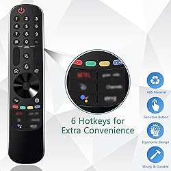 Compatible TV Models: This premium remote is compatible with All 2018-2024 LG Smart TVs with voice and pointer function. MR22GN Replacement magic voice remote control fit for lg remote control for smart tv, OLED Z2, G2, C2, B2, A2 series; QNED Models: QNED99, 90, 85, 80 series;NanoCell Models: NANO80, 75 series; UHD 4K Models: UQ90, UQ80, UQ75, UQ70 series(Notice: If your LG TV does Not support voice control or is a model prior to 2018, the voice function of this magic remote may Not work.) Shortcut Buttons:The lg tv remote replacement with 5 shortcuts popular channels, With point, click, scroll functions, you can select the functions easily by moving and clicking the curson. Get your favorite content as quick as you can at anytime and anywhere. LG tv remote could make your life easier! Easy to Pair: This universal replacement for lg remote control for smart tv can solve your home backup remote needs. Power on the TV and Just insert 2*AA batteries to the remote, point the remote toward the TV, Then press the Wheel (OK). A message will pop up and now the remote is automatically paired with the TV. (Note: batteries not included) Unique Magic Remote Control: This lg-magic-remote has extremely fast response time, it will respond quickly in 0.5 seconds, available directly use distances within 12 meters (40 feet) and it supports over total 120,000 clicks for all buttons via approved tests. It is a genuine LG remote designed to deliver optimal performance and reliability. After-Sale Service: This new lg tv remote is Lightweight and ergonomic design, New upgraded smart chip, stable performance, easily replace missing or damaged remote,keep the same full control functionality of your original remote control. Package contain the LG remote, manual, Any questions will be answered in 24hrs.