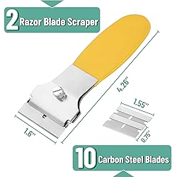 • Bates razor blade scraper set includes 2 high-quality scrapers, providing excellent value for versatile cleaning and scraping tasks.Made from durable materials, these scrapers feature a sturdy metal body with a comfortable yellow grip for enhanced control and safety.Each scraper comes with 10 extra carbon steel blades, ensuring sharp and precise cutting performance for an extended period.The locking mechanism securely holds the blades in place, offering reliable performance and added safety during use.Perfect for removing stickers, paint, and adhesives from glass, tiles, and other smooth surfaces, this set is a must-have for both DIY enthusiasts and professionals.