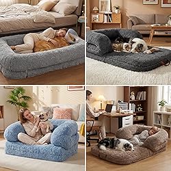 3-in-1 Flexibility: Switch up your lounging game with our 3-in-1 Folding Human Dog Bed! Seamlessly transform between a cozy Classic Bed, a laid-back Lounge Bed, and a chic Sofa. Perfect for naps, cuddling, reading, or gaming in any room. It’s the ultimate spot for comfort and versatility, fitting right into your living room, bedroom, or office Double the Bolster: Experience superior support with our convertible design. Unlike others, our bolster offers double-layered enhanced support in both Sofa and Lounge Bed modes. Plus, the high-quality plush fabric feels incredibly soft, making every moment on this bed pure bliss, like hugging a cloud Orthopedic Bliss for You and Your Pet: Get the rest you deserve with our Human Dog Bed’s high-density egg crate foam. This orthopedic wonder evenly distributes weight, relieving pressure on joints for both you and your furry buddy. It’s a must-have for comfort lovers, turning any lounging session into a rejuvenating retreat Waterproof and Easy-to-Clean: Spills and accidents are no problem with our waterproof cover. The durable, zippered cover keeps the foam fresh and protected. When it’s time for a clean, just remove the cover and toss it in the washing machine. Simple maintenance means more time to chill and less time worrying about messes Safe Comfort, Guaranteed: Sleep easy knowing our Human Dog Bed is safe to use. Made with CertiPUR-US certified foam and OEKO-TEX Standard 100(24.HCN.46956 ) certified materials, ensuring safety standards. The bolster chopped foam is recycled and sourced from leftover mattress production