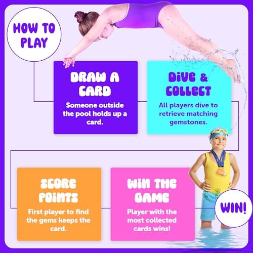- EASY TO PLAY: Draw a card, dive to collect the matching gemstones and score points. The player with the highest score wins the game, making it easy and fun for everyone.