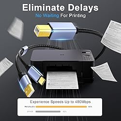 Dual USB Connectivity for Versatile Printing: This versatile 2-in-1 USB Printer Cable supports both USB-C and USB-A devices, allowing connection to USB B 2.0 devices. Its convenient 5FT length perfectly matches both desktop and laptop setups, offering enhanced flexibility and helping to minimize cable clutter. The dual compatibility ensures broad device connectivity, enhancing your setup's efficiency and reducing the need for multiple cables. Exceptional Device Compatibility: Compatible with a wide range of devices, this USB printer cable seamlessly connects for MacBook Pro, MacBook Air, Chromebook Pixel, and various models from DELL, HP, ThinkPad, HUAWEI, and more. It's also suitable for HP Deskjet, Officejet, Envy, Canon, Epson, Brother, Lexmark, Dell, and Samsung models, ensuring a reliable connection across your most essential office hardware. Fast and Reliable Data Transfer: Experience high-speed data transfers up to 480 Mbps with USB 2.0 technology. Perfect for office environments, this cable offers a more reliable connection than wireless printing, without the worry of signal drops or security issues, making large data transfers efficient and secure. This USB B 2.0 cable supply power is very low, and the main function is for data transfer, so it is not recommended for power supply. Gold-Plated Durability and Clarity: Engineered with gold-plated connectors and a tinplate casing, this printer USB cable ensures optimal contact efficiency and reduced signal interference. The fully shielded PVC cable enhances transmission performance, delivering stable and clear printing results. Enhanced Durability with Nylon Braiding: Constructed with tough nylon braiding and an aluminum alloy casing, this printer cable is built to withstand frequent use. Its special strain relief design protects the internal core from damage, ensuring the cable remains functional even with extensive bending, making it 10 times more durable than standard cables.