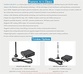 SX1262-LoRa-DTU is a wireless data transfer unit with RS232, RS485 and RS422 interfaces based on the SX1262 module. 850 ~ 930MHz frequency, applicable to Europe, North America and Oceania. Adopts LoRa Modulate and Demodulate technology, with the advantages of anti-interference and long-distance communication (up to 5KM). Supports point-to-point, point-to-multipoints, relay network, AES, etc. The LoRa Spread Spectrum Technology: Compared to traditional communication, LoRa Chirp Spread Spectrum (CSS) and Frequency Hopping Spread Spectrum (FHSS) technologies greatly improve the performance of long-range communication and anti-interference, widely used in military and industrial communication fields. Multiple communication methods:Can Be Set Via Software: Stream transfer mode, Packet transfer mode. AT Command Mode:Users can query the current status of the module or set parameters by sending AT commands. Relay Networking:The radio station can realize multi-level relay networking, suitable for ultra long-range distance or complex environment networking communication, allows multi networking on the same region. AES Communication: The secret key is writable but unreadable, the devices with the encrypted transmission enabled and the same key can communicate with each other normally for greater security. Listen Before Talk (LBT): The module will actively monitor the environmental noise of the channel before sending. If the noise exceeds the threshold, the sending will be delayed. This function can improve the communication success rate of the module in harsh environments, suitable for networking transmission and anti-collision processing. Receive Signal Strength Indication (RSSI): Supports serial port output of data packet signal strength, can be used to evaluate signal quality, improve communication network, and measure distance. Supports serial port output of environmental noise signal strength, can be used to manually realize LBT function.