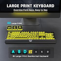 - Backlit large print wired keyboard Large print key It has a large-size printing effect, and its letter size is 4 times that of a standard-size keyboard. The large-sized printed keyboard can reduce eye fatigue and improve input accuracy, so you don’t need to bother to read the keys on the computer keyboard.