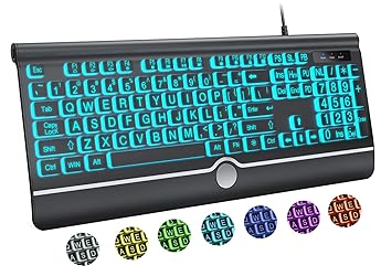 【Large Print Keyboard】- The large keys are slightly spaced, featuring big print letters to lowers the chance of hitting the wrong key. Perfect for elderly, the visually impaired, schools, special needs departments and libraries, as well as companies. 【Bright and Colorful Backlit Keyboard】- Rainbow backlight make the computer keyboard cool and beautiful, allow you use it in dark.There are permanent lighting and automatic breathing lighting modes for your options. You can also adjust the brightness of the backlight according to your preference. 【Full Size & Ergonomics Design】- Unfold the feet at back of the keyboard to reduce hand fatigue and enjoy long hours of playing. Full QWERTY English (US) 104 key keyboard layout with numeric keypad, Large Print keys provides superior comfort without forcing you to relearn how to type. 【Plug and Play & Wide Compatibility】 - This USB keyboard takes away the hassle of power charging or swapping out batteries and is easy to setup. No drivers required.Compatible with Windows 2000/XP/7/8/10, Vista,Raspberry Pi 3/4, Mac OS(Note: Multimedia keys may not fully compatible with Mac, OS System).Works with your PC, laptop. 【Spill-proof】- This durable keyboard features a spill-resistant design. So you don't have to worry about spilling coffee and water. Enjoy Keys life of more than 5000W times.