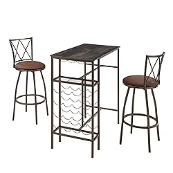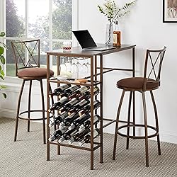 - Introducing our 3-Piece Bar Stools Kitchen Dining Room Table Set, the perfect blend of style, functionality, and durability. Crafted from high-quality particleboard wood and supported by sturdy steel frames, this set is designed to withstand daily use while maintaining its sleek appearance. The dining table features integrated shelves and wine storage, providing ample space to organize your dining essentials and favorite bottles. The bar stools are designed with ergonomic curved backrests and cushioned seats, ensuring a comfortable and supportive seating experience. Safety is paramount, with non-slip covers on the bottom of each stool to prevent accidental slips and falls. This versatile set is perfect for kitchens, dining rooms, or bar areas, seamlessly blending with various interior decor styles. Easy to assemble and maintain, this dining room table set is an ideal addition to any home, offering both practicality and elegance.