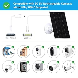 - Our 4W solar panel is compatible with DC 5V rechargeable battery cameras with micro USB or USB Type-C port for security cameras wireless outdoor. Please note that this security camera solar panel is not compatible with Arlo, Blink, Ring, Google Nest, Kasa cameras and any plug-in camera without battery.