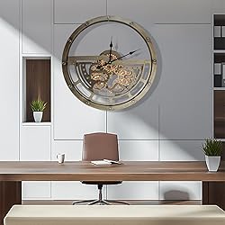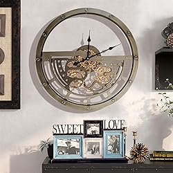 INDUSTRIAL STEAMPUNK DESIGN: Elevate your décor with this elegantly understated moving gear wall clock featuring an industrial steampunk design. With a diameter of 25.5 inches (65 cm) and a depth of 2.1 inches (5.5 cm), it's the perfect accent for any room in your living room, office, kitchen, and more. UNMATCHED CRAFTSMANSHIP: Each oversized wall clock is carefully crafted by skilled artisans using a solid wood frame and hand-painted for a high-end texture. It is not only a beautiful and durable interior decoration. REAL ROTATING GEARS: The exposed gears on this large wall clock are real and rotate independently of the hands. The gears rotate almost silently, providing a unique, dynamic way to experience time. EASY TO USE: The Clock Parlor Decor is simple to operate, with separate hands and gears powered by easy-to-replace AA batteries. We recommend using carbon batteries for optimal performance. (Batteries not included) GREAT VALUE: With premium quality and craftsmanship, our geared wall clocks are an affordable luxury that anyone can enjoy. If you have any questions, please contact us through Amazon and we will provide you with prompt and satisfactory service.