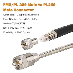 ⭐Ultra Low Loss -- MOOKEERF rg8x coax cable(also called mini-8) is made with pure copper inner conductor,with double shielding to prevent signal leakage,interference and signal loss.It could support better signal transfer with minimum signal loss over large distances and higher frequency use. ⭐Premium Materials -- The inner conductor of this cb coax cable is made with stranded pure copper that made the cable more flexible.The outer conductor is made with Aluminum foil and tinned copper braid which could maximum protect the signal over large distance.More than 95% shield performance,95% resistance to EMI and RFI.Waterproof FEP jacket allows the cable exposure in outdoor harsh environments. ⭐Great Flexibility -- Stranded center conductor made this ham radio coax cable more flexible than other normal cable. ⭐Strong Link PL-259 and FME Connectors -- High quality pl-259 connectors combined with good welding make the connector not easy to break off from the cable.The length of heat shrink tube that connect the rg8x cable and FME connector is upgraded to 2.2",which can better protect the connector from falling off. ⭐Applications -- This cb antenna cable is widly used for any 50 Ohm RF system,such as cb radio,ham radio,vhf radio,antenna analyzer,antenna transceiver,monitor,antenna tuner,dummy load,SWR meter and ect. ⭐Removable UHF Connector -- This cb antenna cable is equipped with a removable UHF connector,making it perfect for installing your antenna in narrow areas such as the vehicle luggage rack,engine compartment cover and trunk.