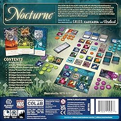 - NOCTURNE - Welcome to the enchanting world of Nocturne, where players embody fox mystics weaving spells and collecting mystical artifacts under the silvery glow of the moon in a whimsical forest setting. Take on the role of a fox mystic casting spells and collecting enchanted items in a magical moonlit forest! These items hold value both individually and when combined to fulfill concoction recipes, adding layers of strategy and depth to the game. Nocturne is a beautiful puzzly game for the whole family. Each time you play you will encounter different Twilight and Moonlight goals, Concoction recipes to brew, powerful player abilities, and a unique layout of the forest to explore. This will necessitate new strategies and tactics to outwit your opponents in this unique highly interactive spatial set collection game! Crafted by the creative minds behind beloved games like Calico , Cascadia , and Verdant , Nocturne promises a magical experience for the whole family.