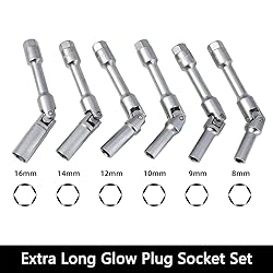 Specification: This 3/8 inches square drive extra long glow plug socket set comes in 5 different metric sizes. The specific sizes are 8mm, 9mnm, 10mm, 12mm, 14mm and 16mm Replace Glow Plug Must Tool: This glow plug socket set help you easily remove and replace glow/spark plugs. It can be held in the socket to keep the tool together during use, which makes the operation more convenient, making it a must-have tool for DIY enthusiasts and even professional mechanics Wide Application: 8mm socket is compatible with Mercedes-Benz, Vauxhall, Opel, Fiat and Lancia etc models. 9mm socket is compatible with Vauxhall, Opel and Fiat etc models. 10mm socket is compatible with Mercedes-Benz and VAG etc models. 12mm socket is compatible with Mercedes-Benz, VAG, BMW, Peugeot, and Renault etc models. 14mm socket is compatible with Renault, Citroën and Peugeot etc models. 16mm socket is compatible with Alfa Romeo, Fiat, Ford, Mazda, Citroën, Peugeot, Honda, Mercedes-Benz, Nissan, Vauxhall, Opel and Porsche etc models Extra Long Design: The socket length is 6.22 inches, long enough that can easily reach hard-to-reach glow plugs deep in the engine or other parts of the vehicle Easy to Use: This 6 point spark plug socket can be rotated nearly 180° in both directions and is adaptable to all angles. And it can be used with 3/8” drive ratchet wrenches and ordinary wrenches
