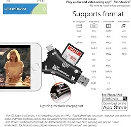 4 in-1 SD Card Reader:The memory card reader has various interfaces,usb / usb c(type c)/micro usb/sd card slot/micro sd card slot and iOS devices charging port for iPhone/iPad,which allows you to easily transfer the required files between different devices. With Charging Port : the sd card reader adds a charging port to its design. When you use an SD card adapter to charge your iphone/ipad devices, You can enjoy charging while transferring file data. No longer worry about power shortage. Real-Time Sharing and Data Management:High-speed two-way transmission allows you to save a lot of waiting time. micro sd card reader provides intelligent file viewing and management functions, allowing you to easily manage data between iPhone /ipad/ Android / computer and other devices. Compatibility:The sd/micro sd card reader support all iPhone with iOS 8.0 and up and iPads with iOS 8.0 or later/OTG Android phone/computer and other devices with usb port,Maximum support memory card capacity 512GB.(the package does not include sd card and micro sd card) Small and Portable:The slim and sleek design + keychain design allows the sd card reader to be placed into your pocket.When you are traveling outdoors or exploring, the keychain can prevent the memory card reader from being lost. And carry it with you.