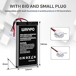 - ❥ Wavypo Upgraded High Quality Grade A for PS4 Battery with UL,CE and Rohs certified. ❥ Made of top-rate A+ Li-Polymer battery cell provide you over 1000+ charging cycles with high-speed and efficient charging. To get best performance for a new battery, below actions will be helpful : 1. Make sure to fully charge and discharge your new battery 3 to 5 cycles; 2. Use your original charger and cable which came with your phone to recharge this replacement battery. 3. When the battery is depleted, it may take a few minutes for indicator to show when recharging; 4. Recharge the battery once every 3 months if it will not be used for a long period of time; 5. The Battery actual using time depends on your phone configuration, system and software setting and signal condition. Specifications: * Battery Capacity: 4000mAh * Battery type: Li-ion battery * Watt-hour: 14.80Wh * Voltage Output: 3.7V