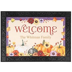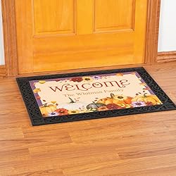 - Extend a warm welcome to all your guests this fall! Colorful autumn-inspired doormat features a welcome message and room for personalization with your family name or a message, all framed by pumpkins, sunflowers and leaves. Non-slip doormat is perfect for indoor or covered outdoor use. Order the mat alone or with a decorative rug tray that serves as a base, with drainage holes for fast drying. Personalize 1 line up to 25 characters. Polyester personalized welcome doormat is 26 3/4" long x 17 3/4" wide x 1/8" high. Rubber tray is 32 1/4" long x 23 1/4" wide x 3/8" high. To prevent fading, keep the fall door mat out of excessive direct sunlight. Wipe with damp cloth. Please note: At this time, we are only able to personalize characters from the English keyboard.