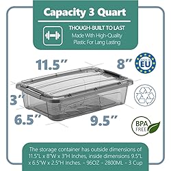 - Introducing our versatile and durable storage solutions: small plastic storage containers with lids. Designed with a sleek, modern aesthetic, these containers are perfect for organizing both home and office spaces. Whether you need to store pencils, markers, crayons, paintbrushes, or tools like screwdrivers, nuts, and bolts, these containers offer the ideal solution. The tinted storage bins allow for easy identification of contents, adding a touch of elegance to your storage setup. With sturdy, easy-to-use latches on both sides, the lids stay firmly in place, keeping your belongings protected from dust. These bins are stackable, ensuring a stable and efficient storage system. Crafted from high-quality plastic, they are hardwearing and resistant to cracking or breaking. Measuring 11.5” L x 8” W x 3” H, with interior dimensions at the bottom of 9.5” x 6.5” x 2.5”, these containers are perfect for small storage needs. With a capacity of 96oz (2800ml or 3 quarts), they provide ample space for your items. Enhance your organization and add a stylish touch to any room with our reliable and attractive storage containers.