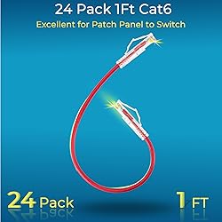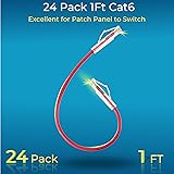 【24 Pack】24-pack of CAT6a patch cables with short length is excellent solution for connecting patch panel to switch and other various devices in high performance. Available in various colors and length of cable patch cords. 【Super Slim】The 28 AWG 1 foot ethernet cable is at least 50% smaller in diameter than 24 AWG cat 6 patch cables. Makes cat 6 ethernet cable 0.5 ft easy to route through cable management panels. 【Widely Use】Cat 6 patch cables 28AWG is specially designed and have become widely used in data center applications. In fact, Cat 6 cables can be used in all applications where patch cord in need. 【Cooling & Airflow】 Above cat6a patch cable can improve airflow and reduce pathway congestion in high-density datacenter. 【Clear Snagless Clip】Clear Snagless Clip of cat 6 ethernet cable 0.5 ft black make it easy to see the switch port and light. Also, easy release from port and save time for patching installation. 【10G Applications 】Cat 6 patch are golden plated to support better network connection up to 10G speed 550MHZ ethernet network. 28AWG patch cable is compatiable with the latest TIA-568.2-D standard and support POE.