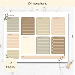 WEEKLY TO-DO LIST LAYOUT: Designed with daily lined sections and easy-to-use checkboxes, this weekly to-do list notepad helps track tasks, manage responsibilities, and check off accomplishments while keeping your entire week clearly organized at a glance. GOALS & PRIORITIES FOCUS: Features dedicated spaces for weekly goals, top priorities, low priorities, and notes, helping you plan with intention, stay focused on what matters most, and align daily tasks with personal or professional objectives. CALMING EARTH TONE DESIGN: Showcasing soothing earth tone colors, a subtle leaf pattern, and refined gold-gilded edges, this planner adds a sense of calm and elegance to your desk while making weekly planning feel more grounded and enjoyable. 52 TEAR-OFF SHEETS: Includes 52 tear-off weekly pages, allowing for a fresh start every week and making it easy to stay motivated, reset priorities, and maintain consistent organization throughout the year without feeling overwhelmed. VERSATILE DESK NOTEPAD: Ideal as a weekly planner, task planner, or to-do list pad for work, teaching, or home routines, this versatile notepad adapts seamlessly to busy schedules, productivity systems, and everyday planning needs.