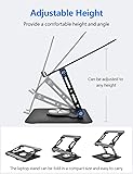 【360° R𝗼𝘁a𝘁𝗶𝗼𝗻】Laptop stand featured with a 360°rotatable axis connecting with the base, it could easily share your screen with someone sitting across the room or at another desk, as well works great for ideas sessions when collaborating with others over video chat or calls. 【F𝗼𝗹𝗱a𝗯𝗹𝗲 & P𝗼𝗿𝘁a𝗯𝗹𝗲】This laptop stand for desk easily lifts your laptop to a higher level, elevates your laptop to your eye level, fully foldable and may be used as laptop standing desk accessories for office, podium pulpit stand, laptop desk riser, laptop desk stand, desktop stand, foldable computer desk, ergonomic stand. 【S𝘁𝗿𝗼𝗻𝗴 B𝗲a𝗿𝗶𝗻𝗴 F𝗼𝗿𝗰𝗲】The computer stand features a strong bearing force and can support as much as 22 pounds (10 kilograms), made of high-quality aluminum alloy, so it's sturdier and has less wobbly, as well the rubber feet prevent the stand from slipping on your desktop. 【W𝗶𝗱𝗲 C𝗼𝗺𝗽a𝘁𝗶𝗯𝗶𝗹𝗶𝘁𝘆】The laptop riser is well compatible with all laptops up to 17-inch, such as MacBook 12 inch/ 13 inch, MacBook Air 13 inch, MacBook Pro 13 inch / 15inch/ 16 inch, Microsoft Surface, Dell, HP, Chromebook, and other devices. Just folding this laptop stand for desk, then you can carry it to coffee shops, your office, or wherever. 【H𝗲a𝘁 D𝗶𝘀𝘀𝗶𝗽a𝘁𝗶𝗼𝗻】Surface of the laptop stand is equipped with a high-quality non-slip adhesive strip to effectively prevent the laptop from slipping off the stand, and the unique X-shape design provides good ventilation and airflow to prevent your laptop from overheating.