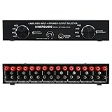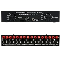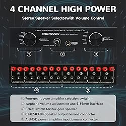 - Channel power: Each channel supports up to 300W,Input channel: support 4 amplifier stereo inputs (not for 5.1 or 7.1 amplifiers),Output channel: Support 2 pairs of passive speakers to output,Input switching: 4-position and 2-position rotary switches,Frequency response: 10Hz-50KHz,Output impedance: 4-16 ohms,Input and output interface: standard red and black banana interface