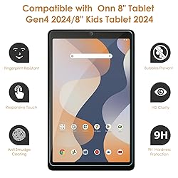 【2-Pack Screen Protector Compatible with Onn 8" Tablet Gen4 2024/Onn 8" Kids Tablet 2024】Tempered glass film provides a safe guard to your liquid crystal screen with protective premium paper package including two sets of cleaning kits, intimate care with two-pack. Please NOTE: Because it is a complete protective film, it may interfere with the entire smart case. Please check your smart case before purchasing. 【All-fit Cutouts & High Response】Rigorous calibration technology ensures all-fit cutouts, including light sensor cutouts, 3D touch cutouts and so on. Full coverage flow fit layer and ion compression molding technology ensures no mistake in screen control, including quick response and 100% accurate touch on the screen. 【Anti-Scatter Prevention】More care with reliable design of anti-shatter. Even if the glass is broken due to any chance, the glass fragments will not spill on the screen. More protective to both you and your electronic screen. 【High 9H Super Hardness】Tempered glass with a hardness of 9H prevents crystal glass from rupturing and protects your precious electronic device. It prevents scratches on everyday things such as gravels, keys and coins in pocket. 【High Transparency Tempered Glass】The 2.5D arc edge processing makes the visual effect clearer and the stereoscopic effect stronger, and the edge of the glass will not scrape your hands.