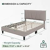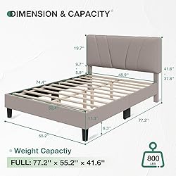 37.8"-41.6" Adjustable-Height Headboard: This full-size bed frame offers a 4-inch adjustable headboard (37.8"-41.6"), catering to mattresses measuring 8-12 inches in thickness. Easily customize the height to match your favorite mattress depth while prioritizing comfort and achieving a polished bedroom aesthetic. No Box Spring Needed: This full size bed frame combines a hardwood frame featuring high-density foam edge padding, 10 evenly spaced solid wood slats, and 10 sturdy solid wood legs. This design provides dense and robust support for weights of up to 800 pounds, ensuring the durability and stability of the full bed frame. Stylish and Comfortable: This full size bed frame blends minimalist elegance with sumptuous foam cushioning, wrapped in premium linen upholstery for cloud-like softness. With clean, sleek lines, it will complement any bedroom decor, adding a touch of elegance and sophistication to your space. Silent Sleep Experience: Engineered with noise reduction anti-slip floor mat protectors that safeguard floors while eliminating creaks and shifts, our full size bed frame features velcro slats for easy installation. Enjoy a tranquil and comfortable sleep experience with our full bed frame. 20 Minutes Assembly: Our full size bed frame comes with all necessary accessories and installation instructions, making assembly effortless. With the assistance of two individuals, assembly can be accomplished in just 20 minutes. Our bed frame made of FSC-Certified wood Versatile Sizing: Available in Full, Queen, and King sizes, this bed frame is designed to accommodate your preferred mattress size (sold separately).