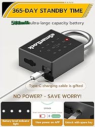 🌟【VERSATILE UNLOCKING OPTIONS】The smart padlock offers 5 diverse ways to unlock - RFID card, passcode, Apple Watch, Mobile App via Bluetooth, and backup mechanical key. It's the key to an intelligent and effortless life. 💪【MILITARY-GRADE ROBUSTNESS】The upgraded padlock has passed 7 strict military-level tests to ensure ultimate security. It features a hardened stainless steel shackle, a crack-resistant zinc alloy body, and a pick-resistant advanced keyhole. Withstanding high forces, it is tamper-proof and pick-proof, giving you complete peace of mind. 🔋【LONG-LASTING BATTERY】The built-in 500mAh rechargeable lithium battery ensures a 12 -month standby time and enables approximately 8000 unlocks after a full charge. Comes with a USB-C cable for fast charging. 🌧️【ALL-WEATHER READY】With IP67 waterproof, dustproof, antirust, and anti-corrosion features, and an operational temperature range from -4°F to 122°F, it's ideal for both indoor and outdoor use, rain or shine. 🎯【WIDE RANGE OF USES】 High quality stainless steel material makes padlock more secure, anti-theft, waterproof, snowproof, rustproof, suitable for garden, fence, warehouse, gate, garage, locker, and other indoor and outdoor places, it is a good choice for self use and gift. 🤝【OUTSTANDING CUSTOMER SUPPORT】Enjoy a 6-month free trial and lifetime technical support. Get a replacement or refund hassle-free within 6 months. Reach out to us anytime with questions.