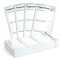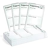 - Features: Imagine the convenience of having a stash of cards at your fingertips, whether you're running a suggestion box in your office or conducting a social event. You can even distribute the cards to individual attendees, encouraging them to share their thoughts with your organization. With these suggestion cards,you can invite customers to submit helpful,feedback,comments and suggestions,which are conducive to your work quality. Specifications: Main color: as the pictures shown Size: 3.5 x 6.7 inch/ 9 x 17 cm Material: quality paper Package includes: 200 sheets suggestion cards Notes: Please allow slight deviation due to manual measurement. The color may exist a slight difference due to different screen displays.
