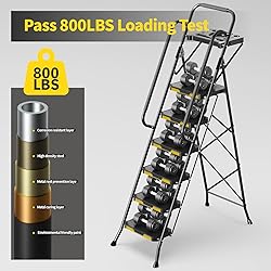 800lbs Sturdy Step Ladder: High quality 6-Step Ladder with the robust high-strength steel frame, which ensure outstanding stability and security, open dimensions: 22.05"L * 44.06"W * 71.22"H, folded dimensions: 22.05"L * 8.5"W * 78.9"H, mantiax capacity testing: 800lbs Safety Locking Mechanism: The locking mechanism is behind the top step for safety use and folding, after unfold the ladder, the unique safety mechanism lock the frame automatically Anti-Slip Widen Pedal: This ladder has a wide pedal with non-slip treads, preventing slips, the 6 steps ladders includes 4 anti-slip feet, adding stability, safety, and protecting your floor from scratches, enjoy peace of mind during your work with this anti-slip and floor-friendly step ladder Space Saving & Portable: The step ladder is very thin after folded, it can be effortlessly stored against a wall, in a corner, or tucked away under your bed or in your closet - without consuming excessive space, step stool crafted from high-quality lightweight steel, this ladder offers portability, allowing you to transport it effortlessly with just one hand Wide Application: This 6-step ladder is a must-have for cleaning, painting, decorating, and all your DIY projects, it allows you to effortlessly reach those hard-to-access areas, perfect for home offices and both indoor and outdoor use, it takes the hassle out of your DIY or cleaning tasks, with this ladder, you can easily complete your projects without the need for stretching or struggling!