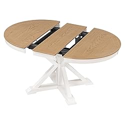Retro Style: This dining table featured in a lovely butterfly leaf and beautiful X-shaped base legs will enhance the charm of any dining room with their classic retro style. There are three colors for you to choose from. All colors are the best color combinations, which bring beautiful decoration to your living room or dining room and add some elegance to your home. Your family and guests will like it. Extendable Table Top: The dining table equipped with a lovely 12" butterfly leaf, which can help you adjust the table top from 42" to 54" according to the number of dinners, greatly seating up to 6 people. You just need to insert the self-storing leaf, and you can get an oval tabletop. If you want to change the tabletop to a round shape, you can enfold the butterfly leaf and then hide them beneath the tabletop. Ideal for Family Use: It can be perfectly integrated in the kitchen or dining room. This exquisite dining table can seat up to 6 people, perfect for family dinner time or friends gathering. In daily life, you can place vases and fruit plates to decorate your home. Premium Quality: OAK veneer tabletop has silk pressing pattern. Solid wood cross-base table legs provide a stable dining table for you, ensuring the stability and durability, so you and your family can take a gathering safely. The table weight capacity is 300 LBS. Easy Assembly: Dimensions: 54"L x 42"W x 30"HThis dining table comes with detailed instructions, and it can be installed step by step following the instructions, which can help you complete the assembly as soon as possible.