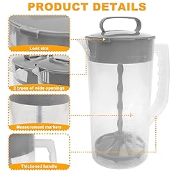 Drinks Mixing Pitcher: Our mixing pitcher is designed with a self angled plastic blade and plunger inside the jug; by pulling the plunger inside the container, you can smoothly mix and stir any powdered beverages and frozen fruit juice concentrates, efficiently stirring the liquids to make them fully blended, and you'll get a delicious mixed drink. Translucent Thickened Plastic Pitcher: Our pitcher with mixer plunger is made of high quality thickened plastic material, the bottle is thick, sturdy, reliable and not easy to be damaged. The translucent design of the bottle allows you to easily identify the liquid inside, and the graduated design of the bottle allows you to control the ratio of water and identify the remaining capacity of the drink. Sealed - No Spills: Both sides of our juice pitcher are sealed with recessed lids, very tight fit, no spills and drips, you can easily rotate the lid to keep it closed and open; you just need to place the lid in the closed position, able to keep the kettle 100% sealed, and then stir the liquid by pulling the piston to make it fully integrated. Easy to Clean: Our plastic spout has an inner diameter of approximately 4.5 inches wide, which makes it easy to fill without splashing, the wide diameter design is easy to clean, and the removable cap and piston design allows you to clean any corner of the drinks kettle without residue or dirt, so you can finish cleaning quickly. Multifunctional Pitcher: Our lemonade pitcher holds approximately 2 quarts of capacity, perfect for stirring anything used to mix frozen concentrated juices, beverages and more, such as juices, tea drinks, milkshakes, chocolate milk, smoothies, iced coffee, lemonade, juice punch, iced tea, mixed drinks and more, you can even use it to make pancake batter with it for a wide range of applications.