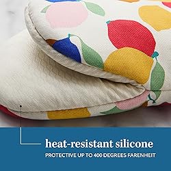 Sur La Table Kitchen Essentials Lemon Zest Citrus Fruit Mini Oven Mitt 2-Pack Set 2 mini oven mitts included, each measuring 5.5"x8" for a comfortable fit 100% Cotton with fruit-inspired print Non-slp silicone printed in palm for flexible and safe grip Heat resistant up to 400 degrees Hanging loops for storage or display Machine wash cold, gentle cycle with like colors, only non-chlorine bleach, lay flat to dry, do not iron