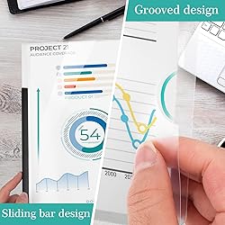 - Product Features:Clear Report CoversSize: 8.9 x 11.2 Inches Quantity: 42 Pack Cover Thickness: 5.5 Mil Material:Plastic Color:Black Feature :Waterproof, Letter Size, Sliding Bar DesignPremium Clear Report Covers with Black Slide Bars - Your Ultimate Organization Solution! Embrace organized chaos with our exquisite set of 42 transparent report covers and 42 matching black transparent slide bars! Crafted with care and precision, these covers are more than just a storage solution – presentation folders are a testament to your professionalism and attention to detail. The versatility of these resume folders is unmatched! Whether you're a busy professional preparing for a job interview, or a financial planner managing complex portfolios, these plastic book covers have got you covered. The presentation binders are perfect for holding letters, spreadsheets, proposals, portfolios, and everything else that keeps you on your toes. The sleek black slide bars add a touch of sophistication, elevating your presentation to the next level. Imagine walking into your next job interview with a neatly organized portfolio, or presenting a compelling proposal to a potential client, all thanks to these report covers. These clear report covers equally adept at holding your financial planning documents, ensuring that every detail is at your fingertips when you need it most. And for the creative souls among us, these sturdy covers are a dream come true for showcasing your artwork, photography portfolios, or even your guitar sheet music collection.Gone are the days of struggling with traditional binders and punching holes. Our clear folder feature a smooth-sliding black bar that makes adding or removing pages a breeze. No more frustration, just seamless organization that allows you to focus on what truly matters!
