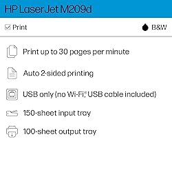 - The HP LaserJet M209d offers fast 2-sided laser printing, easy setup, and reliable connectivity via USB 2.0. This compact monochrome printer fits seamlessly into any office space. It delivers high print resolution for sharp, clear text on every page. Designed with energy efficiency in mind, it reduces power consumption without compromising performance. Ideal for small offices or home use, its quiet operation ensures minimal disruption. The HP LaserJet M209d supports various paper sizes and types, making it versatile for different printing needs. Plus, the included USB cable ensures a hassle-free setup experience.