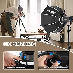 Quick Release and Fold Softbox: This quick release bowens mount softbox with updated convenient quick- release design , easy to setup and folding this softbox by simple clik in seconds. Spend less time assembling and more time capturing stunning shots Honeycomb Grid and Diffusers: Ambitful Mini SE softbox enhance your lighting control with the included honeycomb grid and diffusers. The honeycomb grid creates a directional light beam, while the diffusers soften and distribute the light evenly. Achieve precise and desired lighting effects for your photoshoots Bowens Mount Softbox: The mini bowens mount octagon softbox seamlessly compatible with Godox SL60W SL60IID SL150II SL150III VL150 MS300 MS300V SK400II SK400IIV DP400III DP600III QT600III and other Bowens mount studio strobe lights and continuous LED video lights Professional Octagon Softbox: This Speedlight Umbrella Softbox with a smooth, even silver internal coating on the thickened nylon cloth that broadens, diffuses, and softens light while retaining the original color rendition Portable Drawstring Bag: The mini parabolic softbox crafted with lightweight nylon alloy materials, weights only 0.9 lb/ 0.41 KG ,the folded size is only 40 cm/15.7 inch,is easy to store and transport inside the included drawstring bag. Perfect for portraits, product photography, beauty and fashion shoots, weddings, corporate headshots, and other photography styles