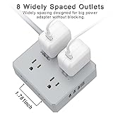 Surge Protector Power Strip - 10 Ft Flat Plug Extension Cord with 8 Widely Outlets and 4 USB Ports(1 USB C), 3 Side Outlet Extender for Home Office, Grey, ETL Listed
