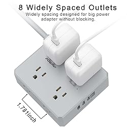 8 Outlets Power Strip with 4 USB Ports:The 3-side power strip with 8 AC widely outlets and 4 USB Charging Ports(Total 5V/4.2A), Each USB A port features 5V/2.4A Max output. USB C Charging Port features 5V/3A MAX. Power up to 12 devices simultaneously.Wide range voltage design, can be used on 120v to 240v circuit. 3 Side Design Surge Protector Power Strip with Wide Space:3-side design that makes it easier to make the plugs not covering any outlet, and the 8 AC outlets with 1.78 inches long space in between, larger than standard 1.5-inch socket. Larger spacing makes it easier to use for all kinds of equipment. The compact design saves more space, suitable for the home, office, and college dorm room. 10 Ft Flat Plug Extension Cord with Cable Ties:10 Feet Right Angled Flat Plug power cord makes it more flexible, Reusable Fastening Cable Ties Can tie up the unused cord and make it better organized. The two mounting holes on back allows this power strip to be securely installed in various applications. Multi Safety Protection:ETL Certificates. This power strip has overload protection, short-circuit protection, over current protection, over-voltage protection and overheating protection. The surge protector with overload protection protects your electrical appliances from lighting, surges or spikes. The minimum energy-absorbing capacity of 900 Joules. It will automatically cut power to protect connected devices when voltage surge is overwhelming. Our After-Sale Service:Our friendly and reliable customer service will respond to you within 24 hours. You can purchase with confidence, with our 30-day return and 12-month warranty.
