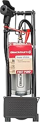Presta/Schrader-compatible reversible pump head with exclusive Top Lock XL lever for easier use Foot-operated mechanism for easy inflation up to 100 PSI Rugged steel construction in a small package for years of reliable service and convenient storage Ball Needle and inflation cone included for all your inflation needs