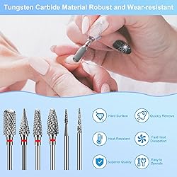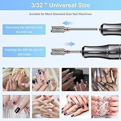 【6 Piece Nail Drill Bits Kits】This nail drill bit kit contains 6 different tungsten carbide cutter bits of fine grain, 1 piece nail brush to meet your polishing requirements in different nail areas; easy to carry and store, the generous and exquisite design is suitable for both men and women 【Premium Tungsten Alloy Nail Drill Bit】The nail drill bit are mainly tungsten steel, this kind of abrasion resistant, not slightly dull, the bits for nail cutters are hard and strong, so you can use it for a long time; Superior nail drill bits excellent heat dissipation of your skin, which is suitable for both natural nails and artificial nails 【Universal sSize Bits for Nail Cutters】Universal size (3/32 inch】2.35mm) suitable for many electric or rechargeable nail machines or manicure machines they can be used; Ideal router attachments for nail studios, beauty salons, spa or private manicure and pedicure; Suitable for beginners, advanced, salon nail technician 【Meets all your needs】Complete with 6 different shapes of carbide nail drill bits, this nail drill bit set meets all the needs of manicure pedicure, for performing a variety of professional tasks such as engraving, grinding, milling, polishing, cleaning the nail surface, Removal of dead skin in the area of cuticles. Sharp and easy to use, saves your time 【Nail Drill Bits Easy to Hold and Clean】Single bit is included in a transparent box, so you can take it with you wherever you go. Nail brush bit can easily clean gel dust on the drill bit, rinse or brush the dust and powder on the bit after each use, then you can use it again