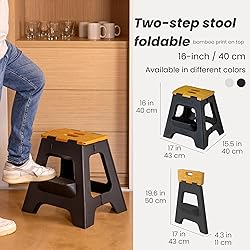 Vigar Compact Step Stool Foldable, 16-inch Two-Step Stools for Adults up to 330 Pound, Lightweight Stool, Non-Slip Folding Step Stool, Black, Bamboo Print on Top
